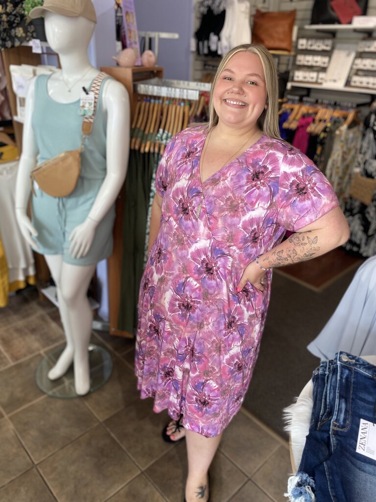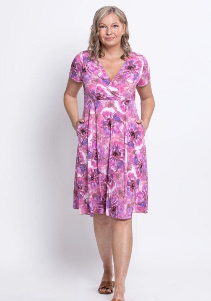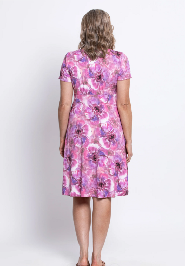 Fabric: 95% Bamboo, 5% Lycra This classic dress is flattering on every body! With a stretch that retains its shape, thanks to our Bamboo fabric. Short sleeves and an empire waist elongate the body. The Aurora is designed to give extra room where needed, without excess fabric.