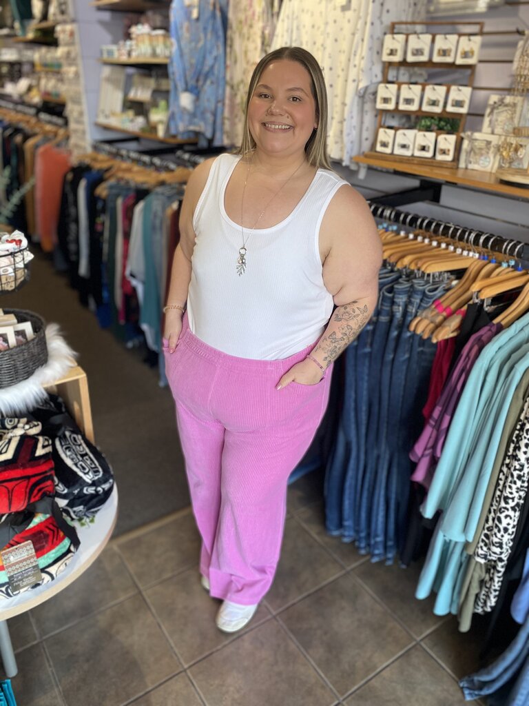 100% Cotton The Parker Pant features pull on styling with an elastic waistband and two front sewn down pockets. A slight crop and wide leg make this pant so easy to wear.