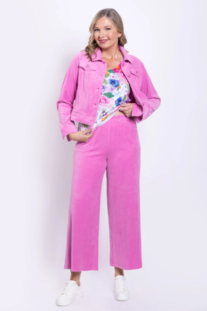 100% Cotton The Parker Pant features pull on styling with an elastic waistband and two front sewn down pockets. A slight crop and wide leg make this pant so easy to wear.