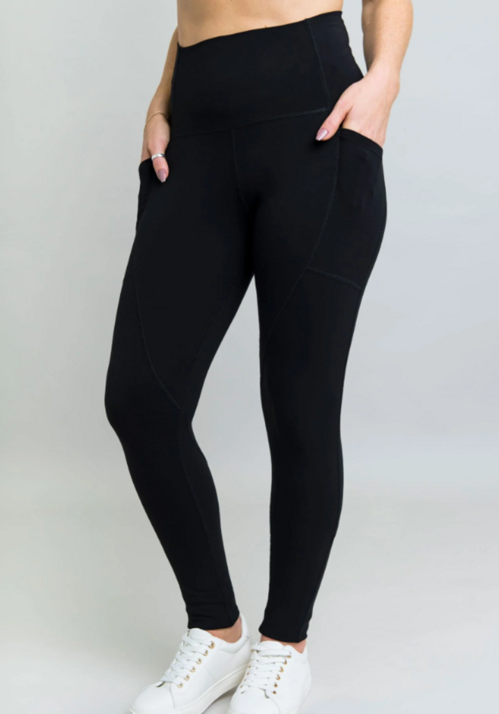 These Leggings feature pockets on the outside of either thigh. Perfect for a workout or just running errands, the pockets are big enough to fit a phone. Features - Flat lay pockets on both thighs - Wide, self-fabric waistband - Flatlock seams Fabric - 67% Bamboo, 28% Cotton, 5% Lycra
