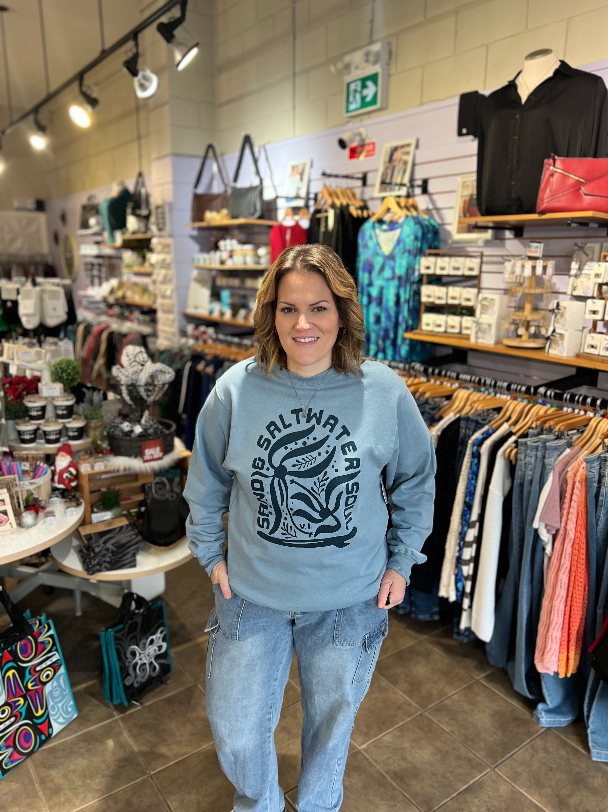 Salt in the air, cozy on your mind. The Sand And Saltwater Soul Crew Neck Sweater, designed and printed in Crofton, BC. Easy to wear, easy to love, and made close to home.