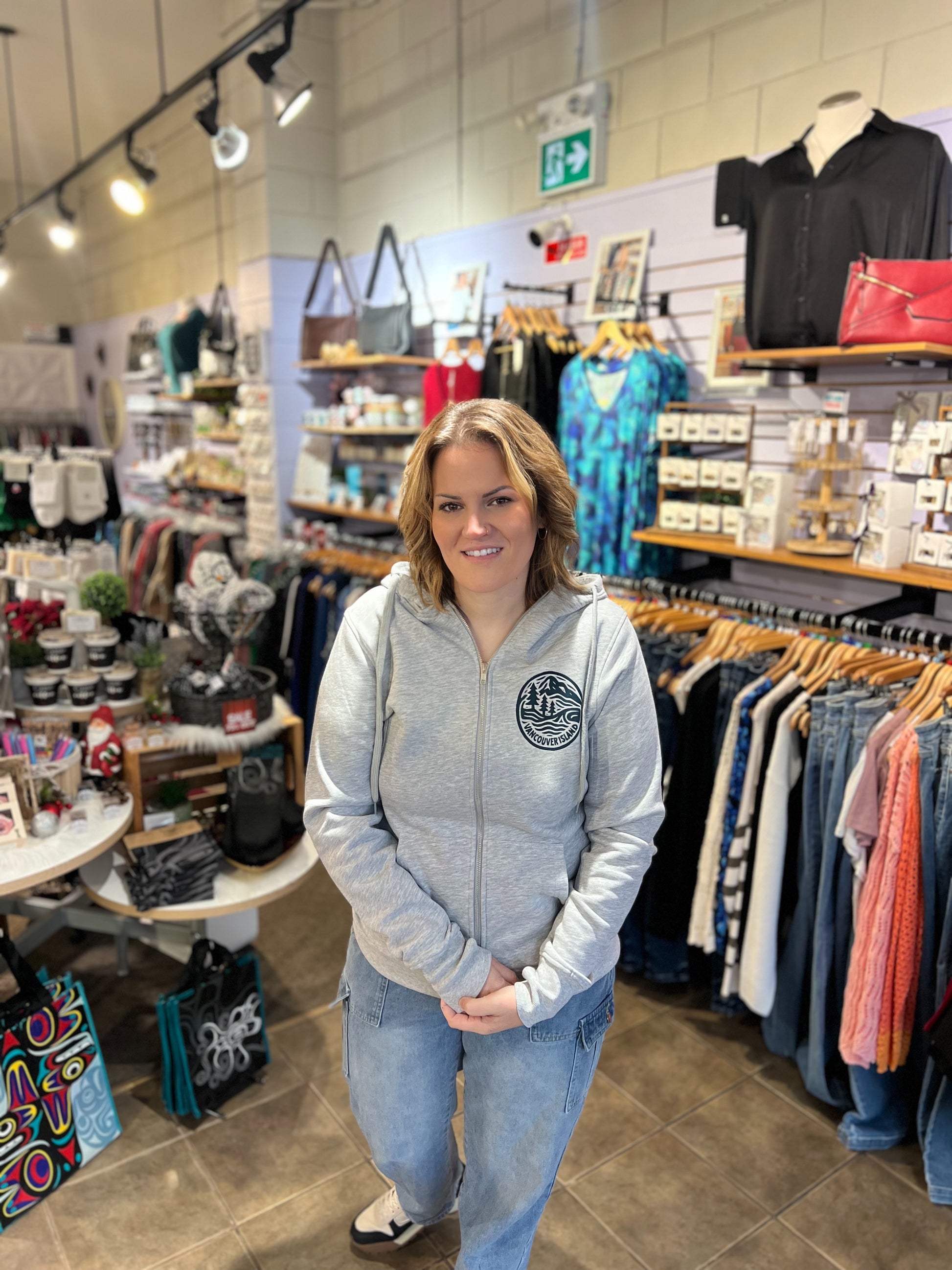 Laid back, cozy, and island inspired. The Vancouver Island Zip Up Hoodie in heather grey, featuring a small front logo with a matching design on the back. Designed and printed in Crofton, BC, and made for everyday wear.